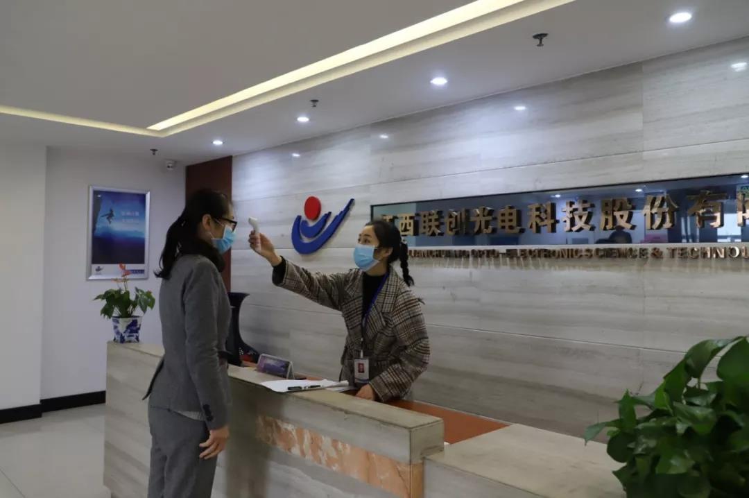 聯(lián)創(chuàng)光電科技園區(qū)實施封閉式管理,人員及車輛需憑核發(fā)的出入證進出園區(qū)。園區(qū)東門崗和南門崗分別設立體溫檢測點,對所有人員進行實名制身份證查驗、體溫測量和信息登記,堅決杜絕體溫異常人員進入園區(qū)和生產(chǎn)、公共辦公場所。