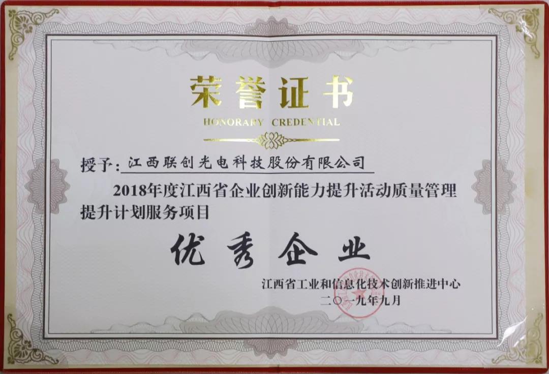 2018年,公司總部牽頭子公司——江西聯(lián)創(chuàng)致光科技有限公司共同參與2018年度企業(yè)創(chuàng)新能力提升活動。此次獲獎表明2018年公司在質(zhì)量管理提升方面所獲得的經(jīng)濟(jì)和社會效益得到了相關(guān)主管部門的認(rèn)可和肯定。公司希望各子公司以此榮譽(yù)為激勵,對標(biāo)先進(jìn),不斷深化推進(jìn)質(zhì)量管理(QC項目),促進(jìn)各子公司的產(chǎn)品質(zhì)量和管理水平不斷提高。